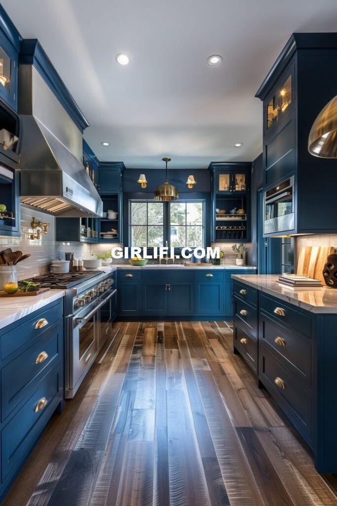 Navy blue looks fantastic on its own, and it adds a bold, elegant touch. If combined with brighter accents, this rich, deep hue adds drama to your kitchen without making it appear overly gloomy. Navy blue gives a sleek, fashionable vibe ideal for modern kitchens. Navy blue can create a stunning contrast if your cabinets are white or light-coloured.